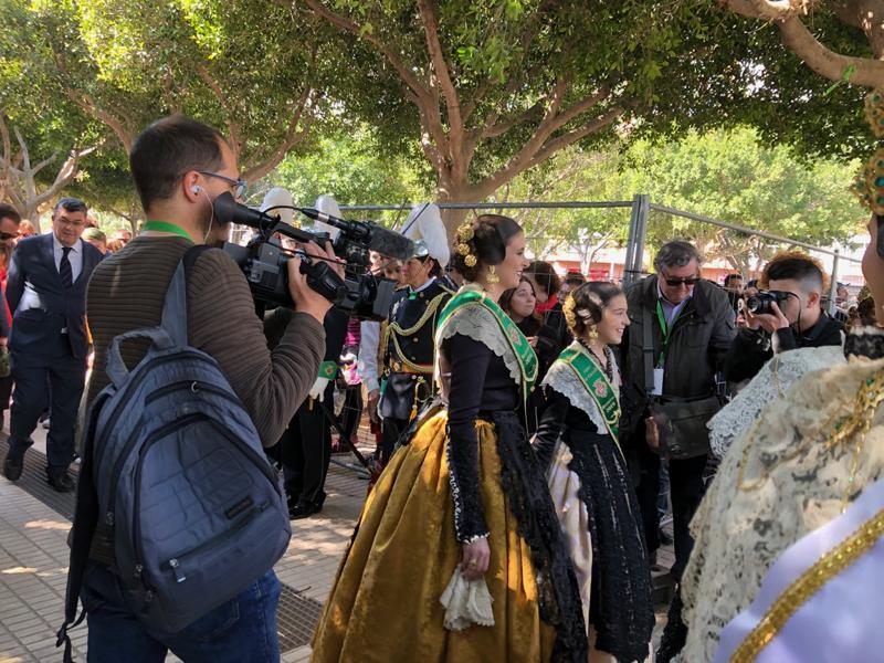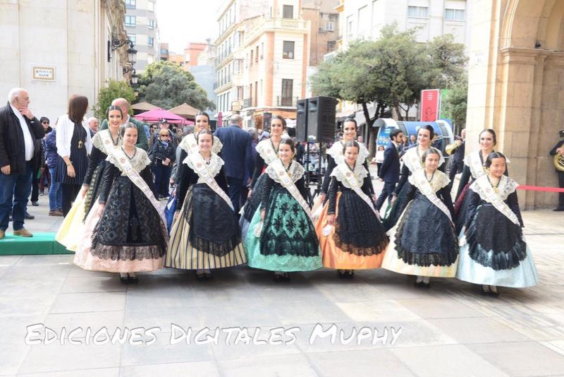 Las reinas de la Magdalena, Natalia Palacio y Natalia Collazos llegaban poco antes de las 12:00 horas, muy aplaudidas por el público y acompañadas por cortes de honor, madrinas, representaciones provinciales y la Junta de las Fogueras de Alicante, con sus Belleas del Foc al frente.
