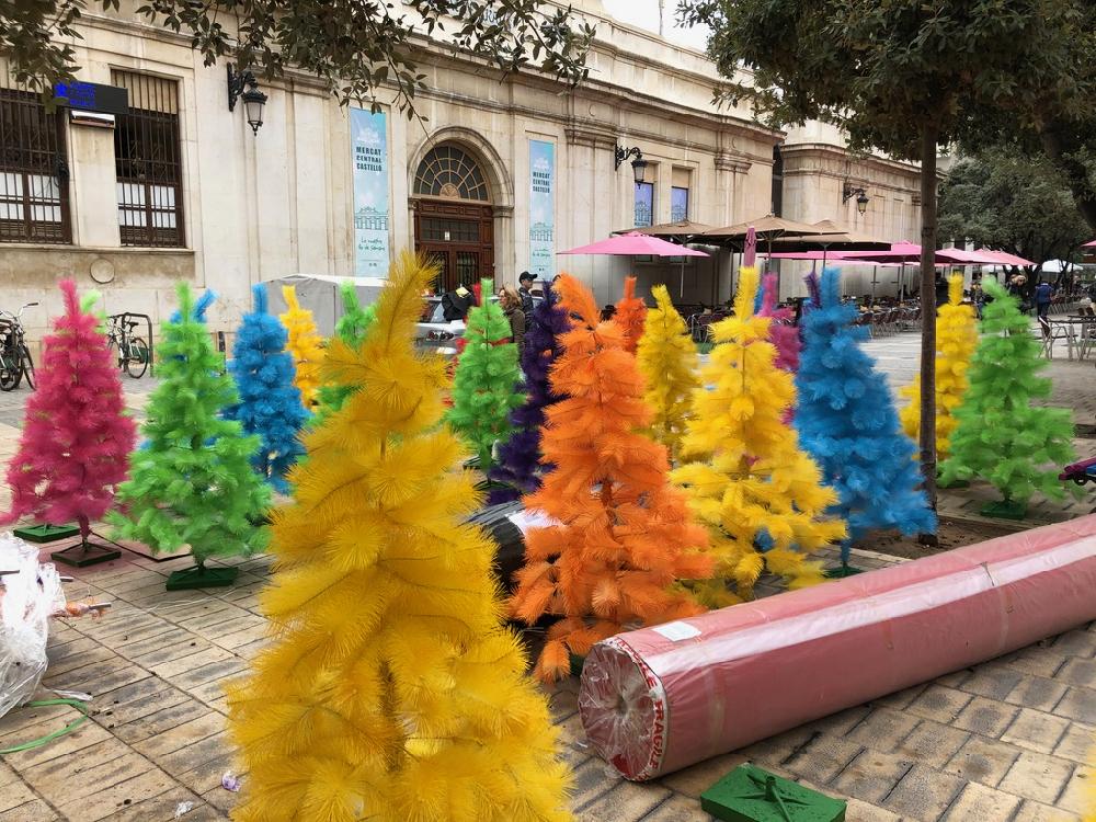 De forma paralela, la plaza María Agustina también cambiaba su aspecto para incorporar motivos infantiles, que ya llamaban la atención de los niños. Las paraetas del Mercado Navideño de Santa Clara Ultimaban sus preparativos esta mañana. Y el montaje ‘Umbrella Sky’ no deja de concentrar a curiosos en la plaza Pescadería donde también se han instalado arbolitos de diferentes colores. Castellón se viste de Navidad.