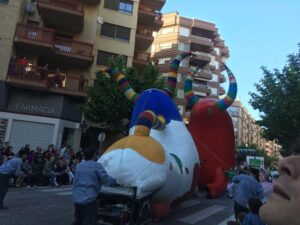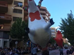 Un dels moments més espectaculars i que més diversió ha creat als més menuts ha sigut la irrupció d’uns unflables gegants que emulaven una vaca i un bou, Magda i Magdaleno, i que es trontollaven d’un lloc a un altre, fent la impressió de caure damunt dels assistents.