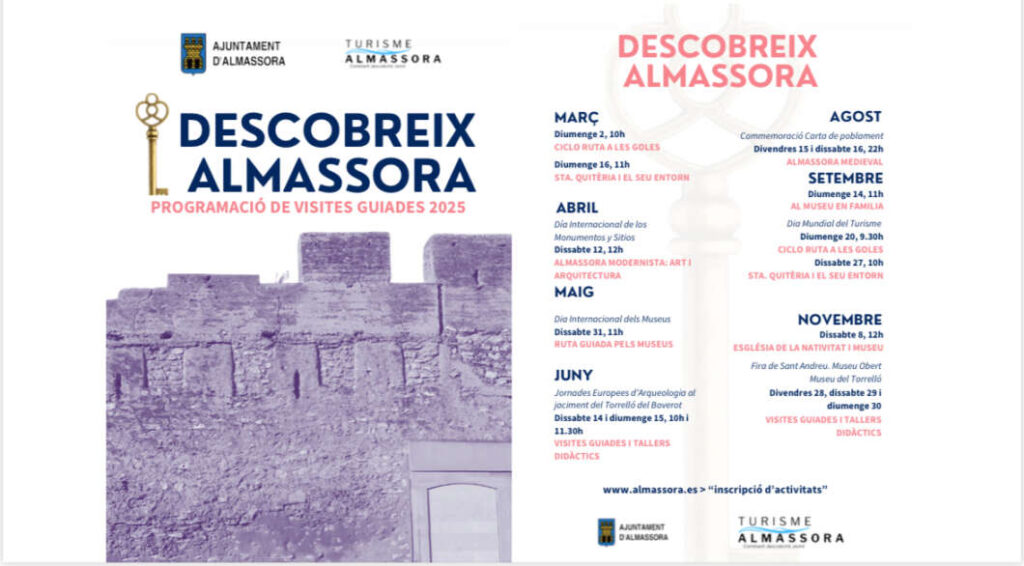 Per tant, durant tot enguany s'han programat un total de 15 visites guiades amb tallers didàctics perquè tant els *almassorins com tots aquells visitants que ho desitgen puguen conéixer i endinsar-se en espais i racons que permeten conéixer de prop el llegat cultural i històric d'Almassora. Totes les activitats són gratuïtes, però es requereix inscripció prèvia en la pàgina web municipal www.almassora.es.