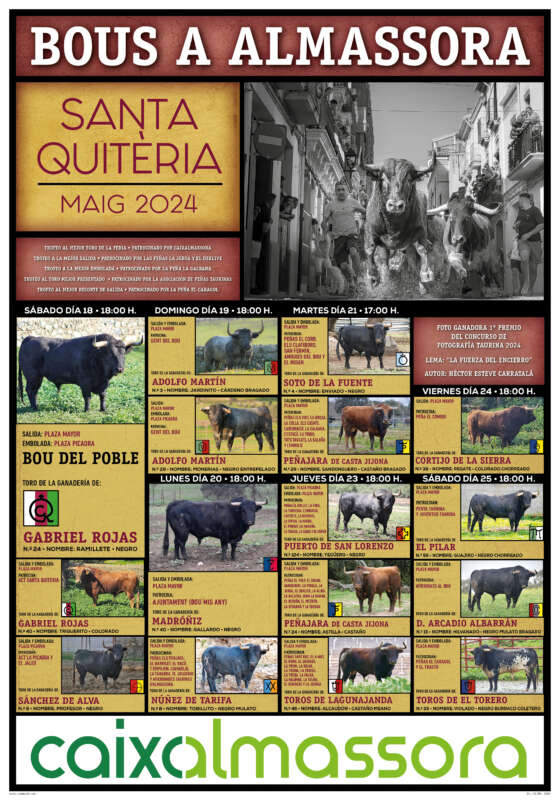 Almassora està ja immersa en l'esperat compte arrere de les seues festes patronals en honor a Santa Quitèria. El regidor de Festes, Arturo Soler, ha presentat l'àmplia programació per a les celebracions, que preveu 120 actes i l'exhibició de 16 bous, situant-se, de nou, com una plaça de primera en el món dels bous al carrer.