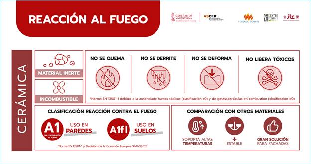 - La cerámica es un material inerte, por lo que es intrínsecamente incombustible independientemente de las condiciones de instalación o uso (clasificado como A1 o A1fl "sin contribución al fuego").