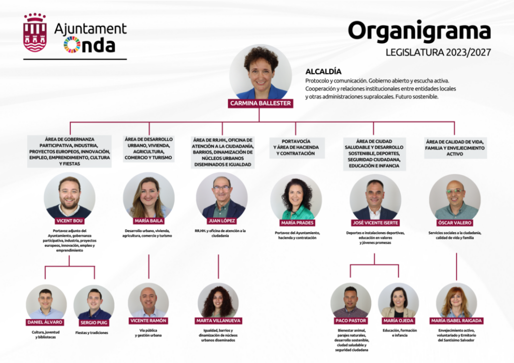 El organigrama comprende 14 concejalías organizadas en seis grandes áreas. Vicent Bou, María Baila, Juan López, María Prades, José Vicente Iserte y Óscar Valero asumirán las tenencias de alcaldía. Como portavoz del Ayuntamiento revalida el cargo María Prades y tendrá a Vicent Bou como adjunto.