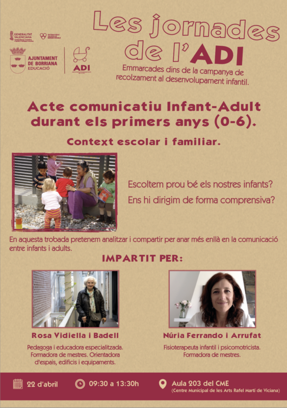 Organitzada per l'ADI amb la col·laboració del Cefire i emmarcada en la campanya de suport al desenvolupament infantil que impulsa l'ADI, la Jornada tindrà lloc al Centre Municipal dels Arts de 9.30h a 13.30h, dirigida a famílies de xiquetes i xiquets menuts i als professionals relacionats amb el món de la primera infància, amb el propòsit d'oferir-los suport professional.