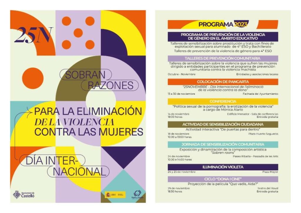 El Ayuntamiento de Castelló se suma otro año más a la conmemoración del Día Internacional de la Eliminación de la Violencia contra la Mujer, que se celebra cada 25 de noviembre y que este año cuenta con el lema ‘Sobran razones’. Y lo hace con actividades que llegarán a toda la ciudadanía, tanto en el ámbito educativo como social.