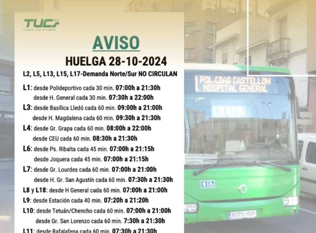 La huelga de transporte convocada para el próximo lunes, 28 de octubre, obliga a la suspensión de algunas líneas de autobús y de Tram en la ciudad de Castelló, ya que según ha anunciado el Ayuntamiento se aplicarán servicios mínimos.
