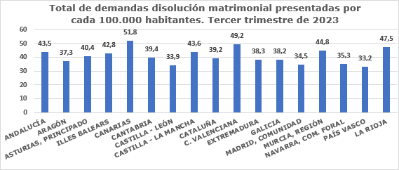 Si se pone en relación el número total de demandas de disolución matrimonial del trimestre con la población a 1 de enero de 2023 por cada 100.000 habitantes, la Comunidad Valenciana ocupa la segunda posición del país, con una tasa de 49,2, solo por detrás de Canarias, que registró 51,8 demandas por cada 100.000 habitantes.  Le siguen La Rioja, con 47,5; Murcia, con 44,8; Castilla-La Mancha, con 43,6; Andalucía, con 43,5; y Baleares, con 42,8.