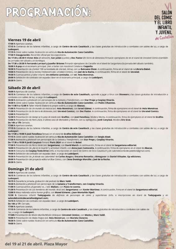Los superhéroes, criaturas galácticas y escenarios de ciencia ficción se dan cita esta semana en Castelló con la sexta edición del Salón del Cómic y el Libro Infantil y Juvenil. Un evento que tras cuatro años recupera la céntrica plaza Mayor, que se convertirá en epicentro literario del 19 al 21 de abril.