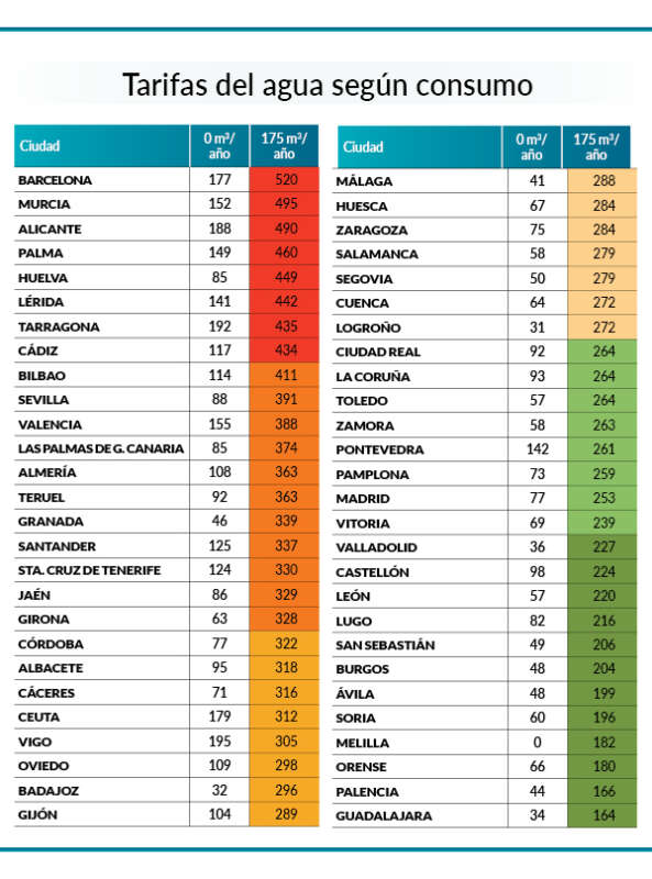 Las ciudades de Barcelona, Murcia, Alicante, Palma, Huelva, Lérida, Tarragona y Cádiz son en las que más incrementa la factura del agua, con cifras que oscilan desde los 400 hasta los 520 euros anuales.