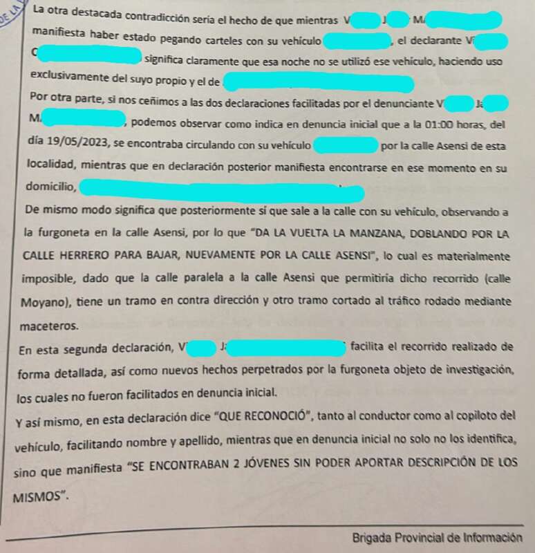 "El portavoz del gobierno pone el acento en que “el PSOE viene a ratificarse en una denuncia donde no aportaba ningún tipo de prueba como se desprende del propio auto y consta en las diligencias policiales. No fue capaz de reconocer ninguna furgoneta cuando lo denunció y ahora pide a la Policía Nacional que identifique al conductor de una determinada furgoneta que él mismo indica sin seguir aportando ninguna prueba, casualmente la que alquiló el Partido Popular en campaña electoral. Lo que tratan es de involucrar a la Policía Nacional, difundiendo información engañosa para confundir a la opinión pública y hacer creer una mentira. La Policía Nacional en ningún momento de su atestado identifica a nadie sino que se limita a facilitar, en función de una matrícula, que el PSOE proporciona de manera interesada, el nombre de la persona responsable del vehículo”, asegura.