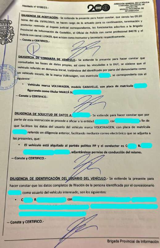 "Un atestado de la Comisaría Provincial ante el Juzgado de Instrucción 4 de Castelló ha identificado al actual concejal de Movilidad del Partido Popular en el Ayuntamiento de Castelló, Cristian Ramírez, como usuario de la furgoneta localizada por el secretario de Organización del PSPV de la capital de la Plana, José Luis López, junto a unas pintadas contra el PSOE en una rotonda de la ciudad durante la campaña electoral de las elecciones municipales de mayo de 2023.