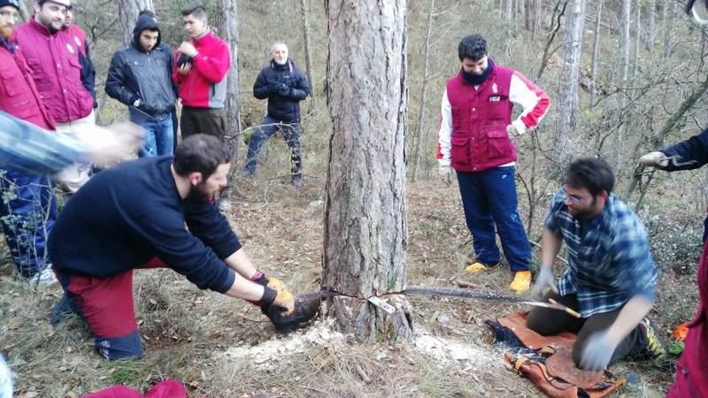 Tras el almuerzo en el monte se eligieron las barras de pino más rectas. La más alta será el "mayo" o pino central sobre el que se sostendrán "les costelles", que servirán para conformar la estructura de la hoguera donde se introducirá a Sant Antoni y Sant Pau.