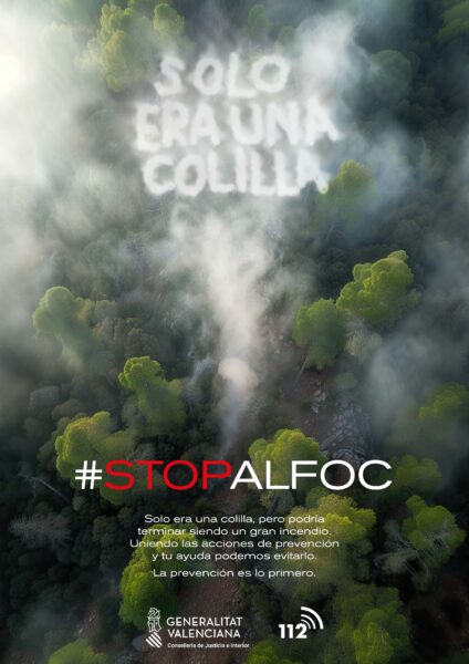 La Conselleria de Justicia e Interior, a través de la Dirección General de Prevención de Incendios Forestales, pone en marcha una nueva edición de la campaña 'Stop Al Foc', una campaña de concienciación en la que la apuesta estratégica se ha centrado en reforzar el concepto de la prevención sobre otros elementos más informativos de años anteriores.