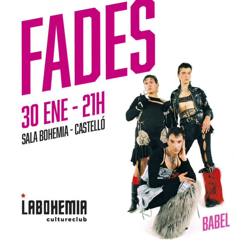 El grup de música de la generació Z, Fades, aterrarà el proper 30 de gener a La Bohemia per celebrar la gran festa queer en català. L'obertura de portes s'efectuarà a les 21.00 h i el concert començarà a les 21.30 h per conquerir Castelló amb la seua música. Amb dos àlbums a la seua esquena, el grup queer es caracteritza per l'autotune, els sons electrònics i un projecte basat en l'amistat. Les entrades es poden aconseguir anticipadament per 15 € punxant ací. Les entrades en taquilla tindran un cost de 18 €.