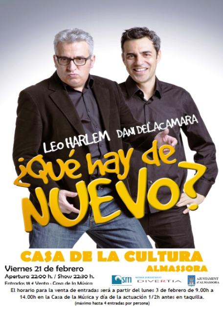Almassora disfrutará mañana de uno de los monologuistas más reconocidos del panorama nacional. De la mano del departamento de Cultura del Ayuntamiento de Almassora, Leo Harlem y Dani Delacámara se subirán al escenario de la Casa de la Cultura con el espectáculo '¿Qué hay de nuevo?'. “Se trata de uno de los mejores espectáculos de humor que se pueden ver a día de hoy en España y mañana tendremos la oportunidad de disfrutarlo en Almassora”, ha comentado la titular del área responsable, Nuria Felip.