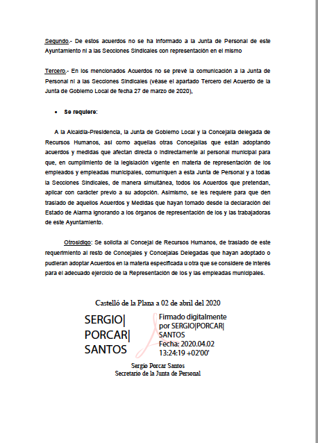 La Junta de Personal del Ayuntamiento de Castelló ha remitido un requerimiento dirigido a la alcaldesa y al equipo de Gobierno, porque entienden que se está incumpliendo la legislación durante el estado de Alarma al no informarles de las medidas que se adoptan y que afectan a los trabajadores municipales.