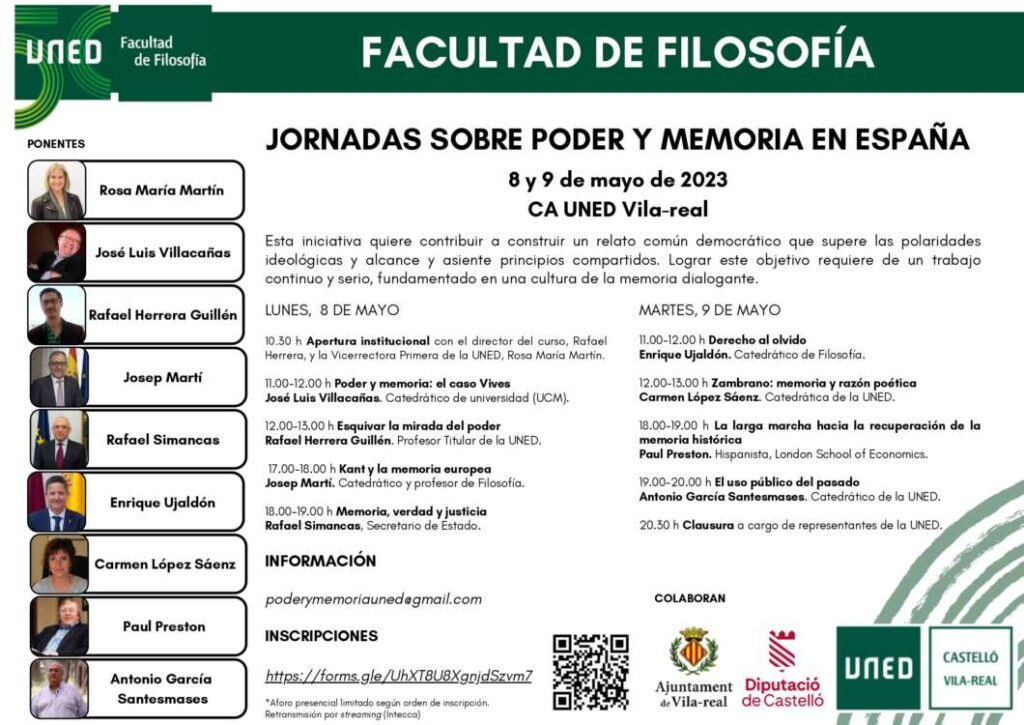 El centre de la UNED de Vila-real acull les ‘Jornades sobre poder i memòria en Espanya’ els propers dies 8 i 9 de maig. Es tracta d'una iniciativa impulsada per la Facultat de Filosofia de la Universitat Nacional d'Educació a Distància que busca contribuir a construir un relat comú democràtic que supere les polaritats ideològiques i abast i assente principis compartits. Aconseguir aquest objectiu requereix d'un treball continu i seriós, fonamentat en una cultura de la memòria dialogant.