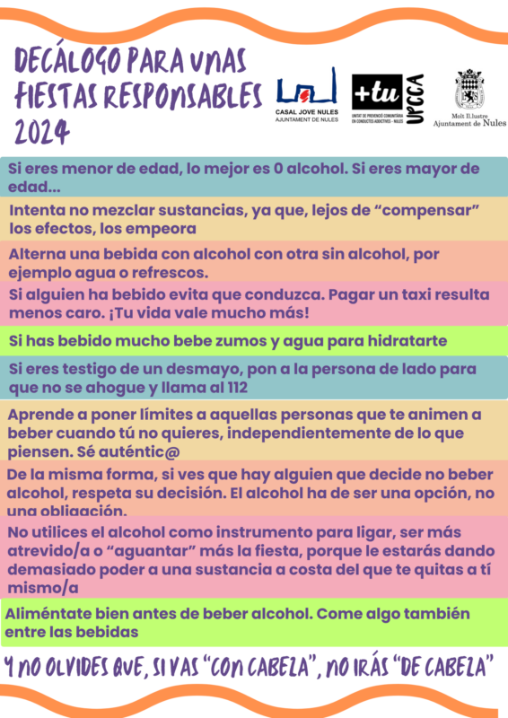 “Amb el lema triat per a les festes d’enguany es busca promoure el coneixement i la prudència a l'hora de beure alcohol sempre que la persona siga major d'edat. En aquest sentit, el primer consell que inclou el decàleg és que les persones menors d'edat no beguen alcohol, pel fet que el cervell a eixes edats encara està en procés de desenvolupament”, comenta la regidora de Joventut i de Festes, Blanca Silvestre.