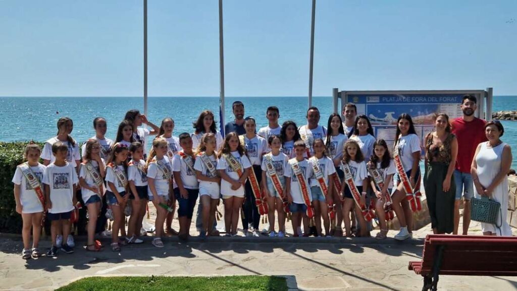 Las reinas de fiestas y sus cortes de honor han izado este mediodía la Bandera Azul en la playa de Fora Forat
