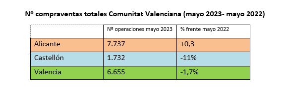 En cuanto al número de compraventa de viviendas, se aprecia una bajada del 0'5% frente a mayo del año anterior. De nuevo, si tenemos en cuenta las compraventas registradas sobre todo tipo de inmuebles el descenso es mayor, alcanzando el 1'9%. En la Comunitat Valenciana se contabilizan 16.124 compraventas de todo tipo de inmuebles, de las que 8.846 corresponden a viviendas.
