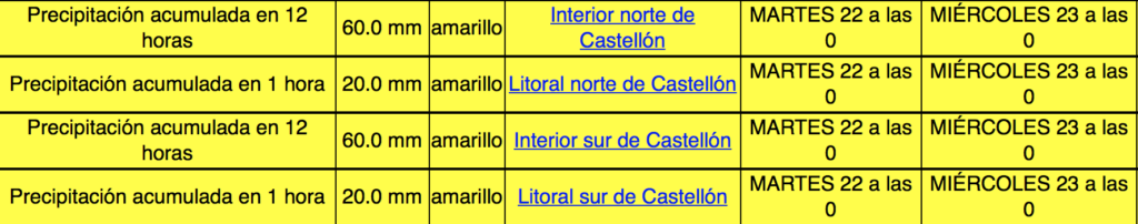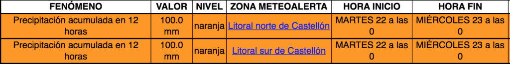 Los servicios meteorológicos y de emergencias llevan alertando hace días de un nuevo frente o episodio de gota fría, conocido como DANA, que alcanzará el nivel máximo naranja en la Comunitat y en concreto en todo el litoral de la provincia, con precipitaciones de hasta 100mm/12h. En el interior la alerta será de nivel amarillo por lluvias, de 20mm/h- 60mm/12 y por lo que respecta al temporal costero, olas de hasta tres metros.