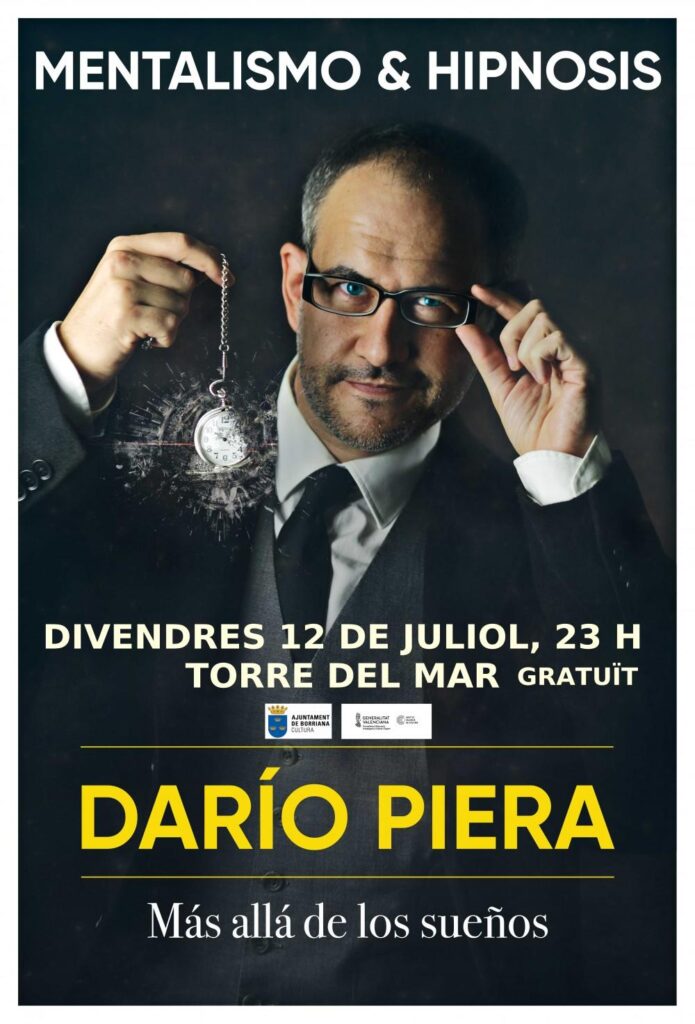 El dia 12 de juliol, tindrem a la Torre del Mar a Darío Piera amb l'espectacle de màgia i mentalisme Més enllà dels somnis. Una bona estona que converteix allò que passa a l'escenari en un viatge pel món dels somnis on es difumina el possible i l'impossible. Viu en primera persona una de les experiències més sorprenents, divertides i increïbles. Tota una espectacular vivència que ens farà vibrar, sorprendre'ns, riure...