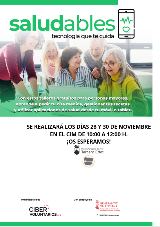 La Fundación Cibervoluntarios pone en marcha 'Saludables' en Oropesa del Mar, un programa gratuito donde las personas mayores empadronadas en el municipio aprenderán a utilizar aplicaciones móviles de salud para mejorar su calidad de vida. Estos talleres se impartirán el 28 y 30 de noviembre de 10 a 12 horas en el Centro Integral De Mayores (CIM).