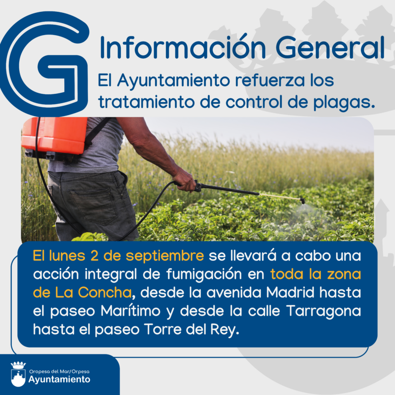 El próximo lunes 2 de septiembre se llevará a cabo una acción integral de fumigación en toda la zona de La Concha, abarcando desde la avenida Madrid hasta el paseo Marítimo y desde la calle Tarragona hasta el paseo Torre del Rey. El Ayuntamiento de Oropesa del Mar ha reforzado las medidas de control de plagas en el municipio, especialmente aquellas que afectan a cucarachas y mosquitos.