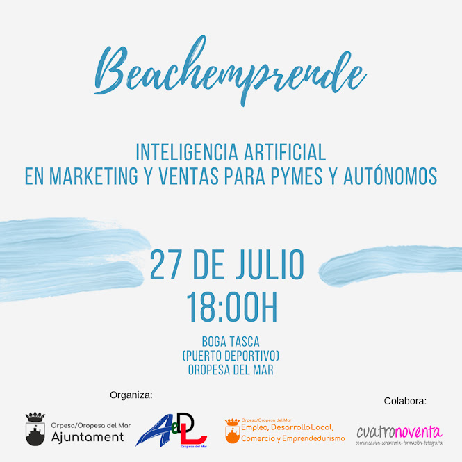 El próximo 27 de julio Orpesa del Mar celebra un nuevo Beachemprende en esta ocasión en Boga Tasca (Club deportivo de Orpesa del Mar) en el que hablarán de un tema de máxima actualidad en el sector empresarial, inteligencia artificial dirigida a ventas en marketing de autónomos y empresas.