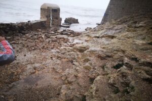 Además los fenómenos costeros asociados a Gloria se han traducido en graves efectos sobre su patrimonio monumental. A los pies del Casco Antiguo, frente a la muralla renacentista, en la cara norte de la ciudadela, se ha identificado un agujero que, a fuerza de los golpes de mar, está erosionando el firme de la zona que en estos momentos es ya muy inestable. El Ayuntamiento ha acordonado la zona y prohibido el paso. "Vamos a estar muy atentos a los efectos de este intenso temporal marítimo a nuestro litoral, muy especialmente a todo el entorno del tómbolo que forma el Conjunto Histórico Artístico; recordemos que en el último temporal de mar se produjeron desprendimientos en los acantilados, así que en cuanto amaine, deberemos realizar un reconocimiento de la zona exhaustivo para valorar posibles daños y programar acciones de recuperación" ha explicado el propio alcalde, Andrés Martínez.