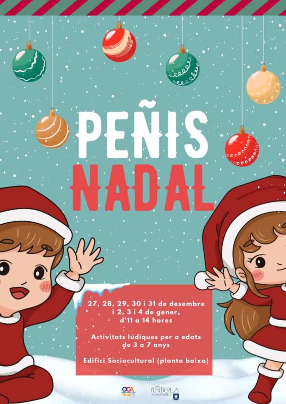 El Ayuntamiento de Peñíscola prepara su salón infantil navideño, Peñisnadal. Como es habitual, año tras año, la concejalía de Bienestar Social programa dentro de las actividades destinadas a los más pequeños este programa, coincidiendo con las vacaciones escolares. Actividades, talleres y actuaciones para los niños y niñas en el edificio sociocultural, en horario de 11h a 14h.