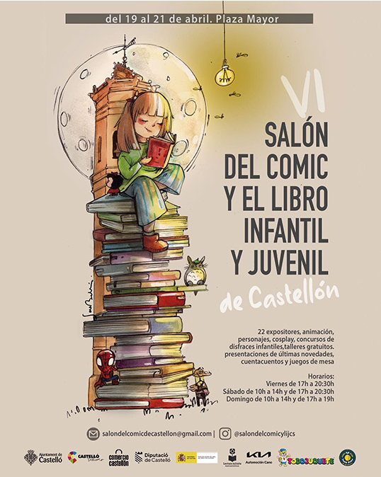 El IV Salón del Cómic y el Libro Infantil y Juvenil da comienzo este viernes 19 de abril en la plaza Mayor de Castellón. Esta edición cuenta con 20 expositores y una multitud de actividades. La feria se abrirá a partir de las 17:00 horas y el primer día estará abierta hasta las 20.30 horas. El horario del sábado será de 10:00 a 14:00 y de 17:00 A 20:30 horas mientras que el domingo permanecerá abierta de 10:00 a 14:00 y de 17:00 a 19:00 horas.