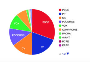 Peu que fa al Senat, les resultats han variat un poc, ja que encara que les socialistes han obtés la majoria dels vots i el PP ha quedat segon, en tercera posició està Podem, en quarta Cs, en cinquena Més Compromís i en sisena Vox.
