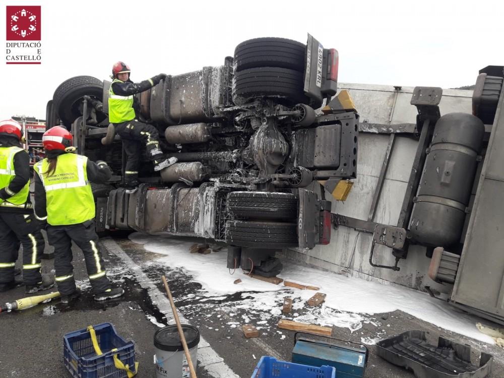 Los bomberos del Consorcio Provincial trabajan en el retirado de combustible en la AP7 a su paso por Alcalà de Xivert.
