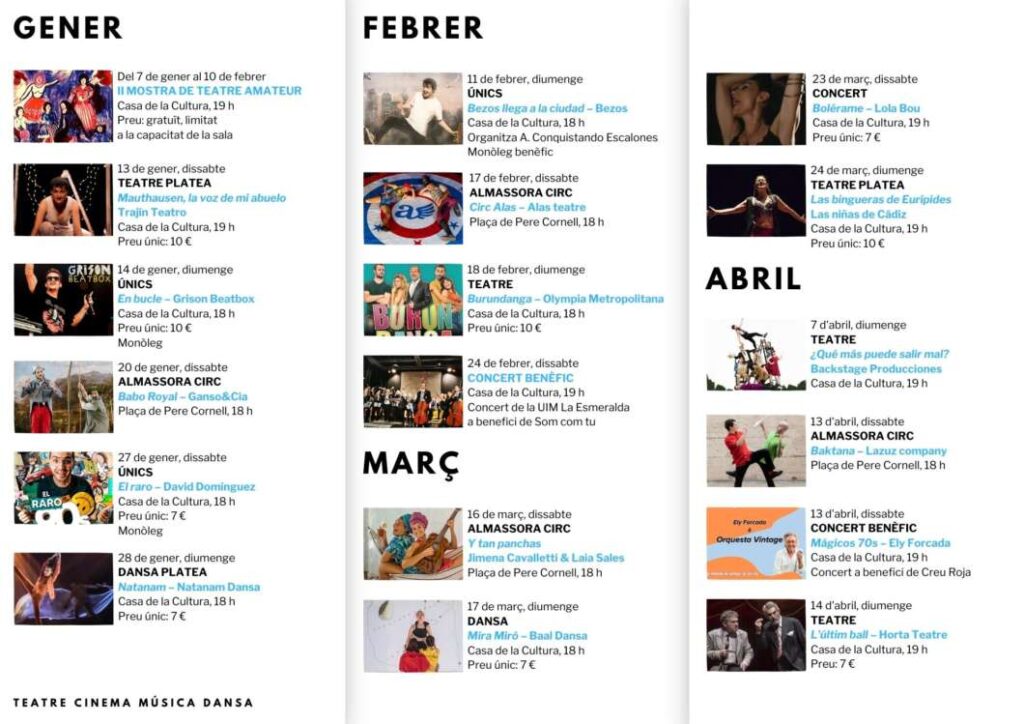 A l'abril, el dia 7, la companyia Backstage portarà la funció teatral Que més pot eixir malament i, el diumenge 14, tindrà lloc la funció L’últim ball d'Horta Teatre. El circ tornarà el dissabte 13 amb l'obra Baktana de Lazuz company. Eixe mateix dia se celebrarà el concert Màgics 70 s, a càrrec de Ely Forcada, amb accent solidari, ja que la recaptació anirà destinada a Creu Roja.
