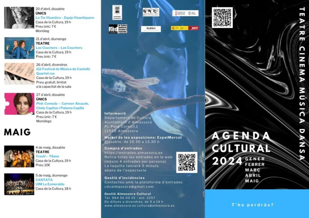 Teatre, monòlegs, dansa, circ i música donen forma a l'àmplia programació cultural que l'Ajuntament d'Almassora ha preparat fins al mes de maig. El regidor de Cultura, Vicente Blay Casino, ha presentat l'agenda que ve carregada de tota una sèrie de propostes, que són garantia de diversió, humor i molt entreteniment. La majoria dels espectacles tenen a la Casa de la Cultura l'escenari principal.
