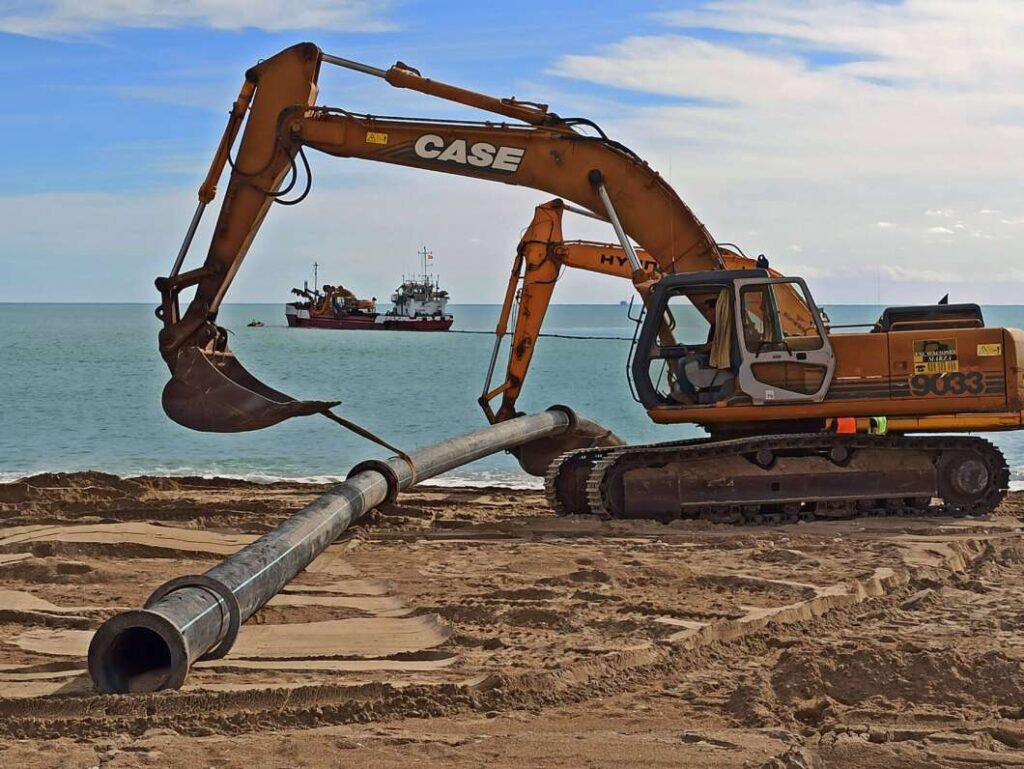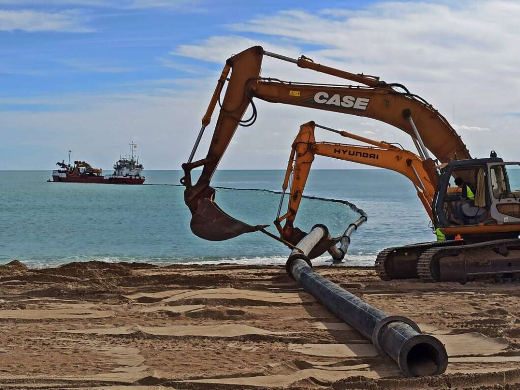 La draga que estaba realizando trabajos de dragado en el puerto de Vinaròs se ha trasladado frente la playa del Fortí para aportar arena y regenerar esta playa paralela al paseo marítimo.