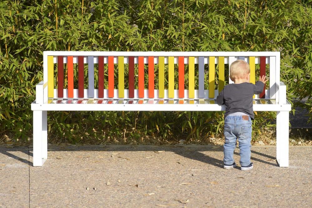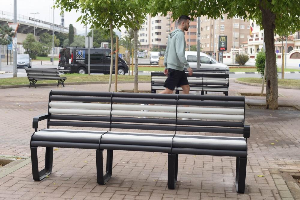 Així doncs, s'han disposat sis bancs en els voltants del Palau de la Festa, que es corresponen amb el model Minimal, fabricats amb una composició de peces ceràmiques en colors blanc, roig, groc, taronja, morat i verd i l'estructura metàl·lica en blanc. Aquesta gamma cromàtica va d'acord amb el disseny de la façana ventilada del Palau, també realitzada amb ceràmica.