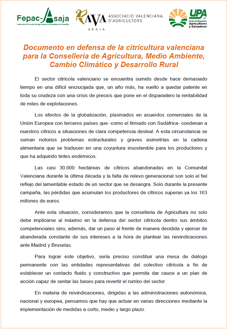 Momentos después una comisión formada por nueve responsables de las organizaciones agrarias convocantes -tres por cada una de ellas- fue recibida por la consellera de Agricultura, Elena Cebrián, y su equipo, a quienes entregaron un documento con las principales reivindicaciones del colectivo. Además de la adopción de medidas concretas a corto, medio y largo plazo, AVA-ASAJA, FEPAC-ASAJA Castellón y UPA-PV reclaman al departamento agrario de la Generalitat que ejerza de abanderado de los intereses citrícolas ante Madrid y Bruselas, así como que constituya una mesa de diálogo permanente con todas las entidades representativas del colectivo a fin de establecer un contacto fluido que permita dar cauce a un plan de acción capaz de sentar las bases necesarias para revertir el rumbo negativo que sigue el sector. Tras la reunión, los dirigentes agrarios explicaron que la consellera se mostró receptiva a las peticiones planteadas y se comprometió a trabajar sobre la base del documento presentado.
