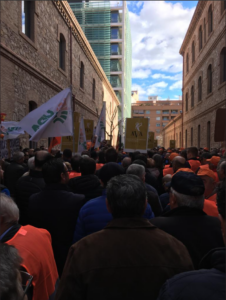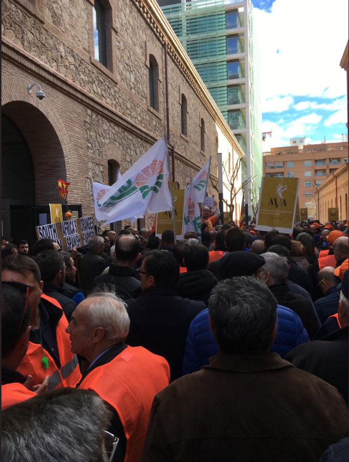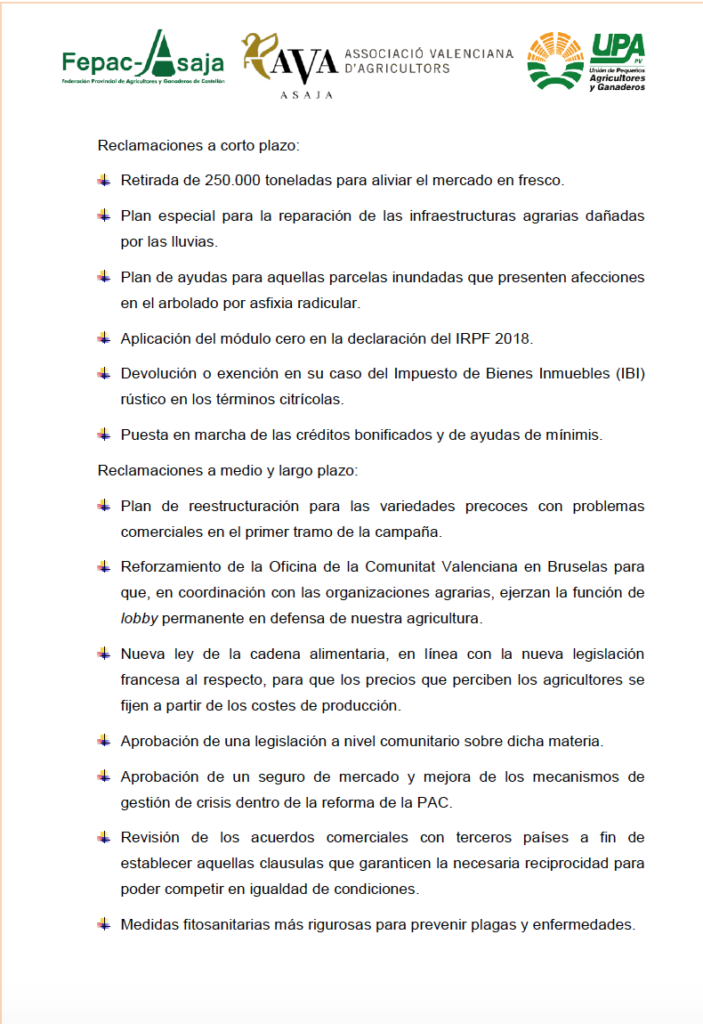 Los dirigentes de las tres organizaciones agrarias se dirigieron a los reunidos y todos ellos coincidieron en destacar el respaldo multitudinario que había obtenido la convocatoria y la importancia de permanecer unidos para hacer sentir la fuerza del sector a la hora de reclamar sus derechos. El presidente de AVA-ASAJA, Cristóbal Aguado, reclamó "la renegociación de los acuerdos comerciales con terceros países que compiten de manera ventajista y desleal con nuestras naranjas" y agregó que "nuestras peticiones se dirigen tanto a la Generalitat, como al Gobierno central y la Comisión Europea porque tenemos que hacerles saber que la Comunitat Valenciana está en el mapa".