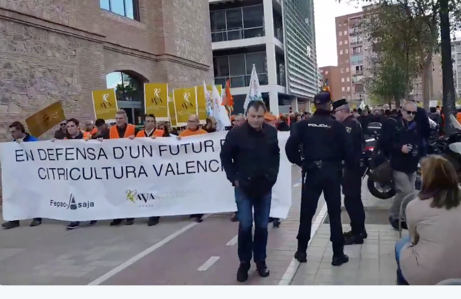 Las organizaciones han cortado el tráfico durante algunos minutos para, acto seguido, iniciar una marcha que dio la vuelta al complejo administrativo del Nou d´Octubre y donde volcaron cajas de naranjas en medio de una pitada ensordecedora. Aguado, reclamó "la renegociación de los acuerdos comerciales con terceros países que compiten de manera ventajista y desleal. Mientras, las formaciones políticas ‘se suman al carro’ de las demandas de los agricultores