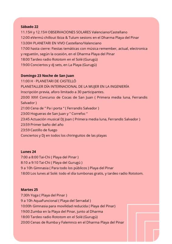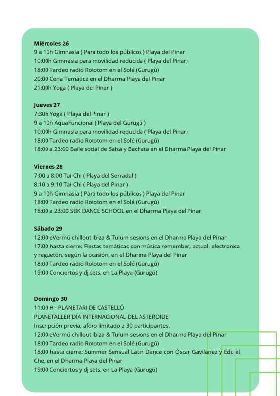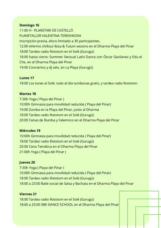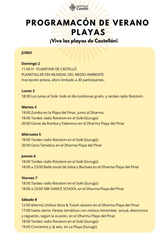 Esta refrescante agenda veraniega está formada por un amplio abanico de actividades para todos los públicos que tendrán como epicentro la costa castellonense, así como otros escenarios de la ciudad, como el puerto, el parque del Pinar, el parque Ribalta o el Planetario.