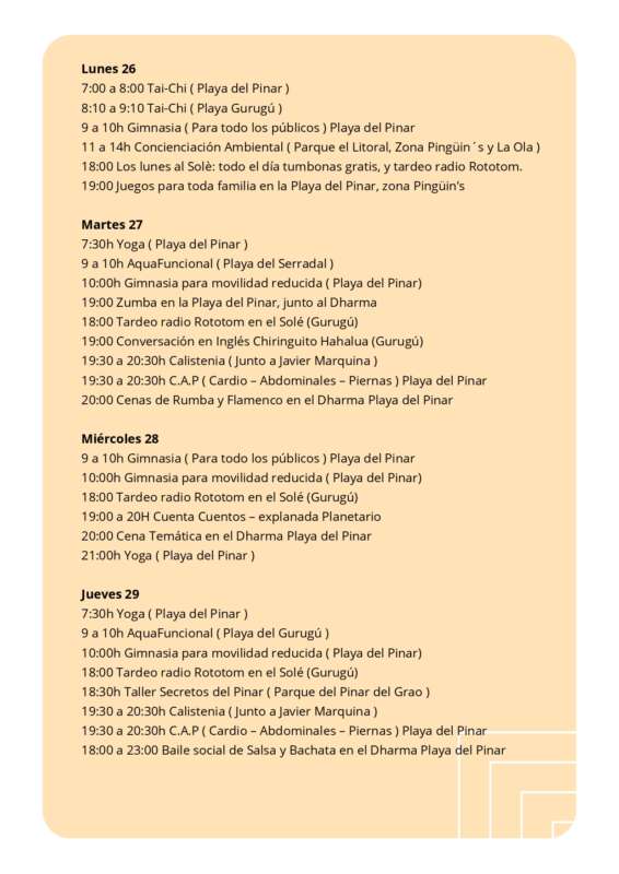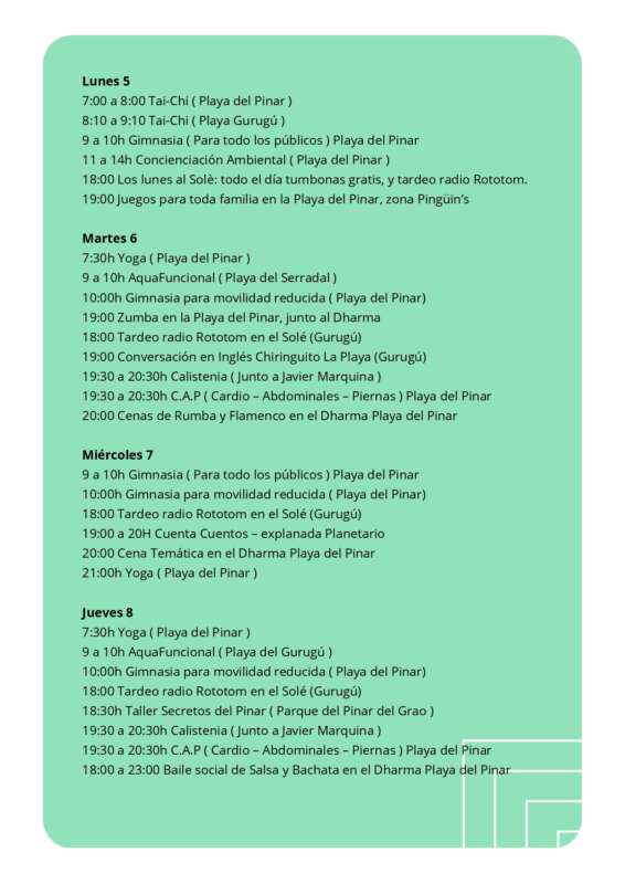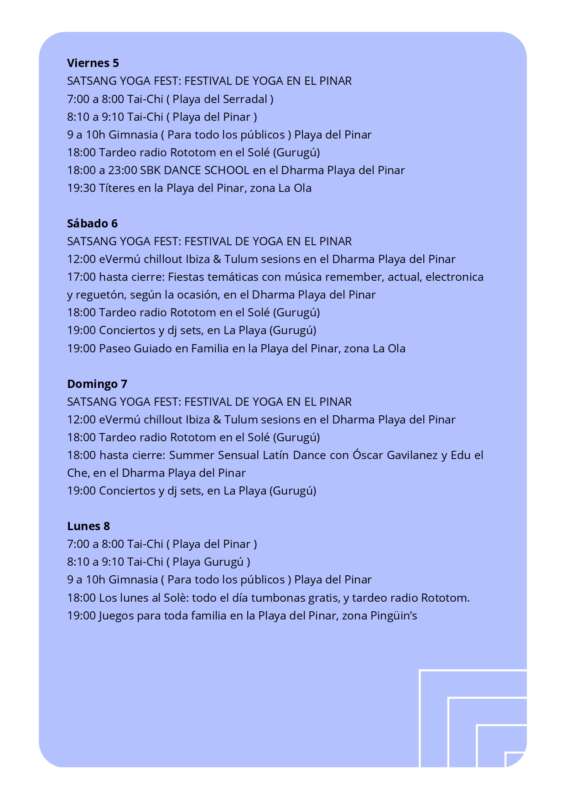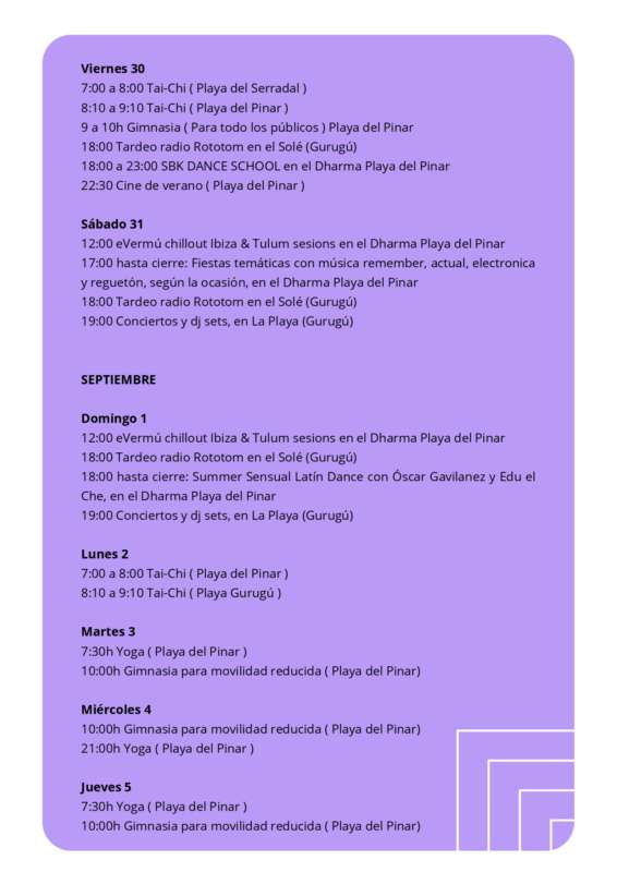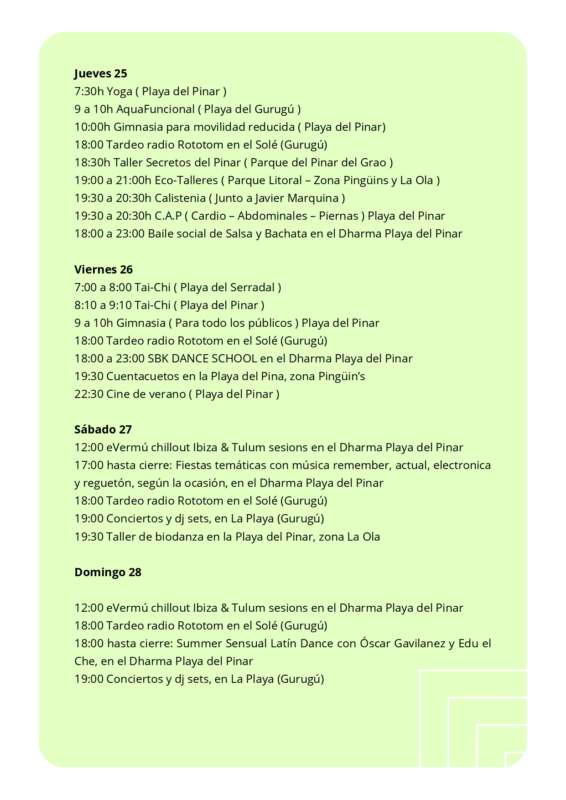 Por otro lado, se ofertarán clases de yoga y gimnasia de mantenimiento en la playa del Pinar, que estarán acompañadas por el Festival del Yoga que este año se celebrará por primera vez en el parque del Pinar del 5 al 7 julio.