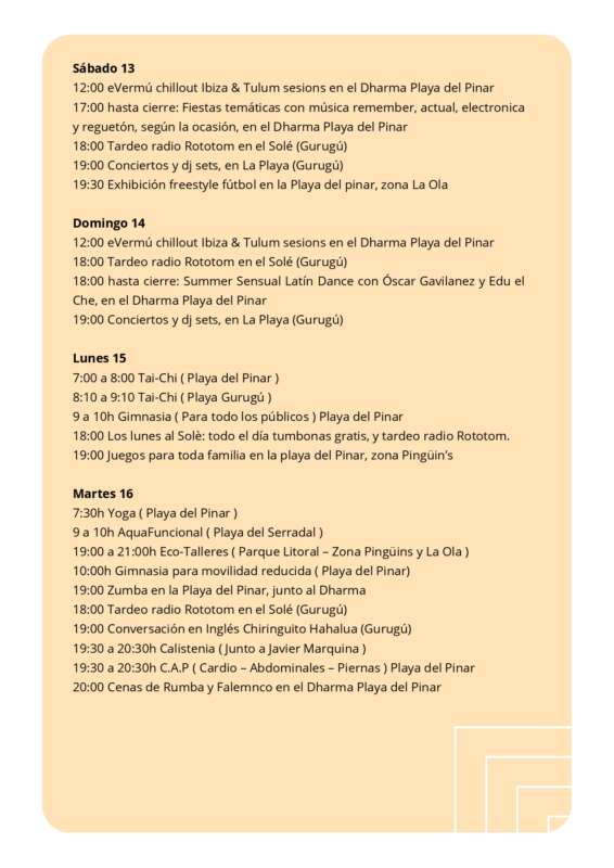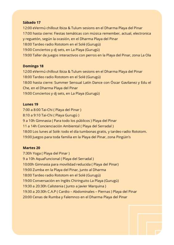 Además, el Solé acogerá una exhibición de esculturas de arena el 10 de agosto, mientras que el día 11 ofrecerá un taller infantil sobre la misma temática. Todos los chiringuitos de la playa tendrán sus propias actividades, como cenas y fiestas temáticas, bailes de salsa y bachata, conciertos o hamacas gratuitas (Solé) durante todos los lunes del verano.