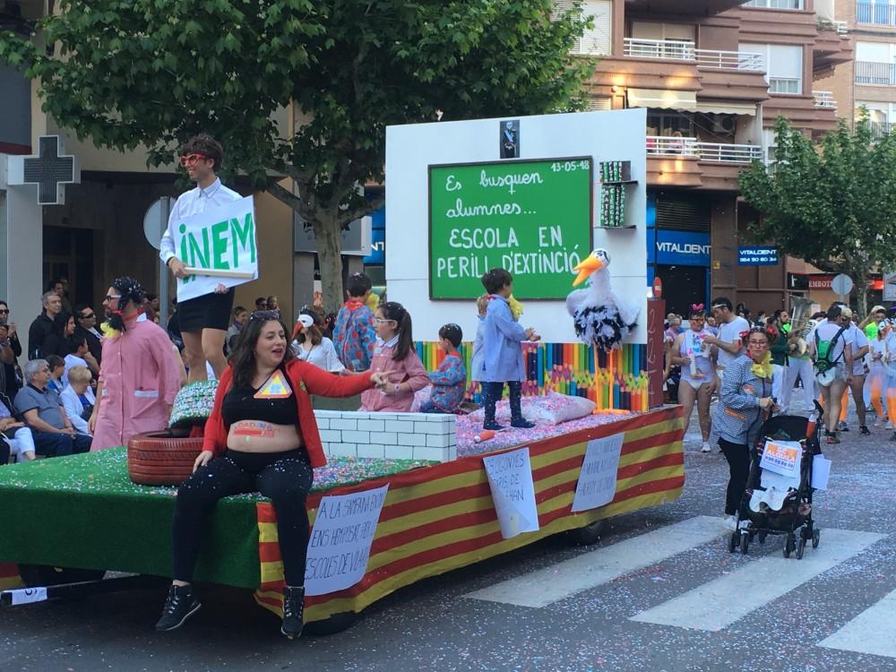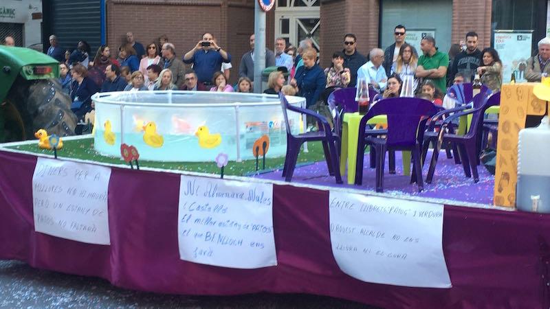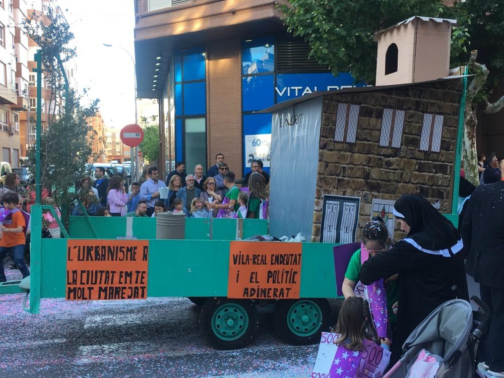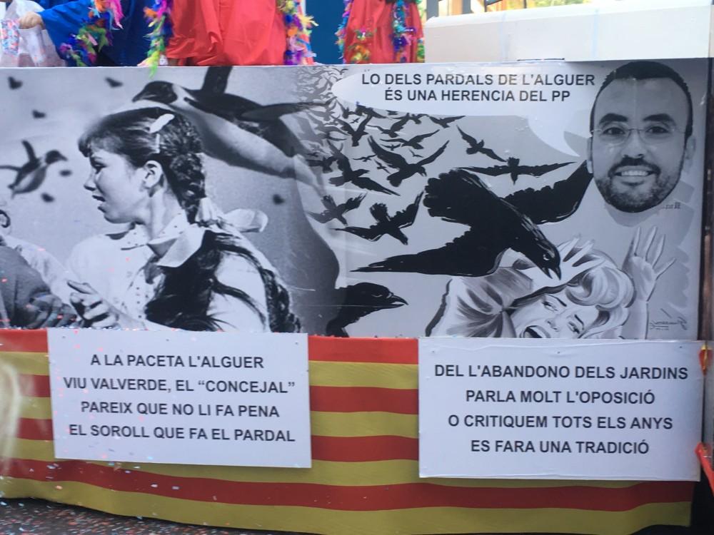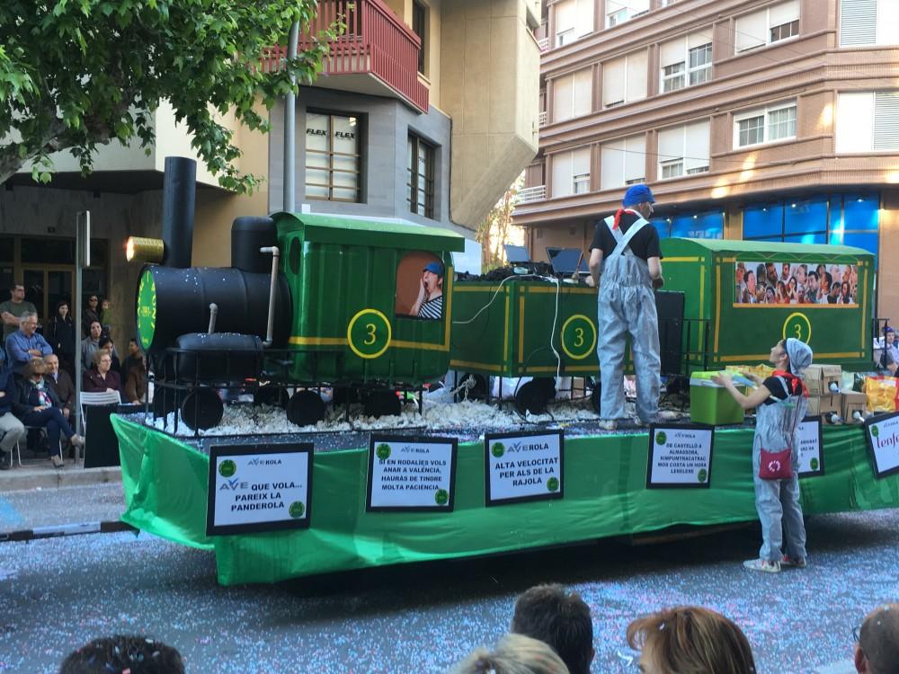 Han participat un total de catorze penyes, entre elles Kalauela, Xarbot, Casal i punt, La traca, Puche a les sis i mitja, Samfaina, Desaire, La titubea, Sarau que ha reivindicat la millora de l’estat de les pistes del pavelló Sebastià Mora, que es puga usar el Casal de la festa i han preguntat de manera retòrica quan serà una realitat el Pavelló Campio Llorens. Beu i Fuig ha sigut també de les més crítiques, ja que en la seua carrossa han denunciat la brutícia de la zona de l’Avinguda Francesc Tàrrega, amb el beneplàcit del músic, ja que una hi havia una rèplica humana molt aconseguida de l’escultura del músic i compositor ubicada a la plaça Bayarri. Es podia llegir “A la paceta de l'Alguer viu Valverde el 'concejal', pareix que no li fa pena el soroll que fa el pardal”. L’Abaetjo ha criticat les deficiències d’enllumenat en la zona del Barranquet i Pocs i Bojos han fet referència a les sentències urbanístiques que amenacen l’Ajuntament, les quals han exemplificat amb maletins. La idea sembla que ha agradat a l’alcalde, José Benlloch, i altres regidors, que no han dubtat en fotografiar-se amb ells. Fem festa han ironitzat sobre el futur estany amb ànecs de la cafeteria cultural del Molí la Vila.