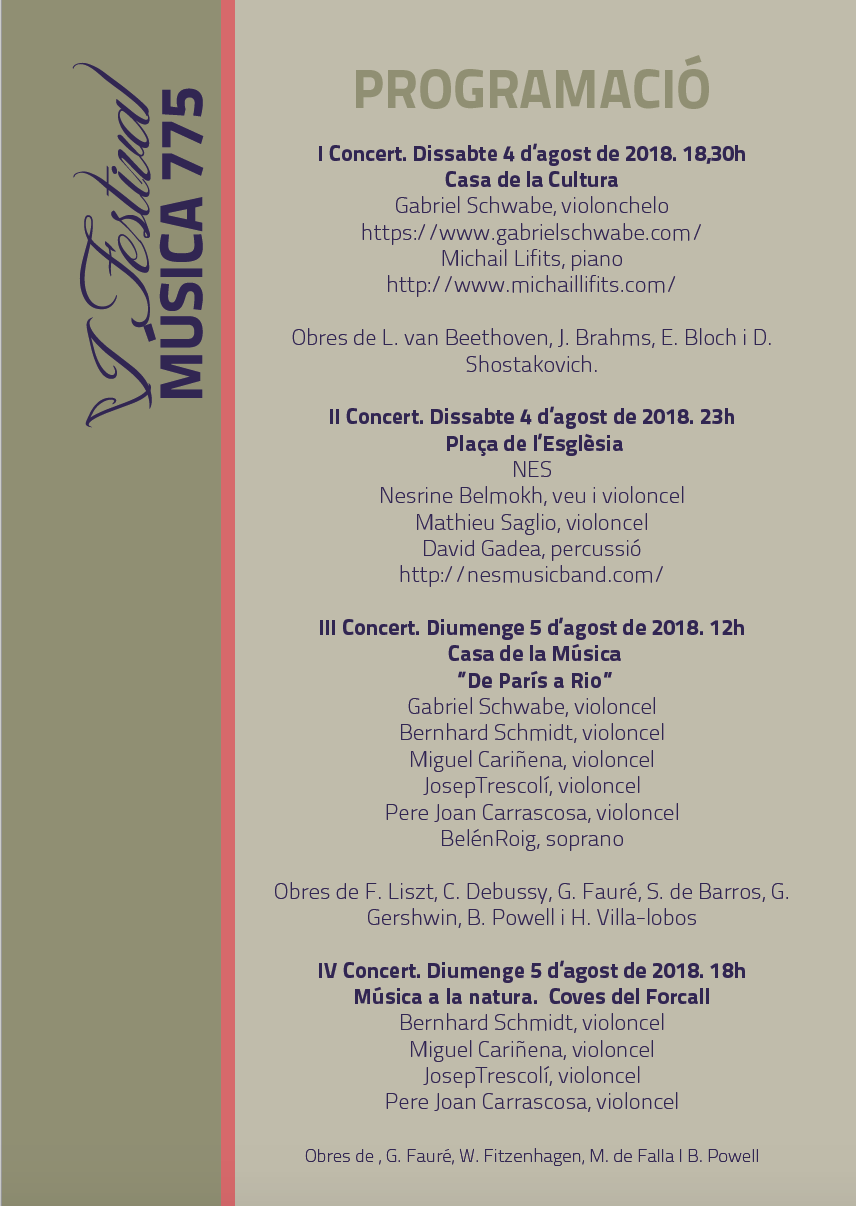 La programació comença el dissabte a les 18:30 amb el concert del violoncel·lista Gabriel Schwabe i Michail Lifits al piano a la Casa de la Cultura. En el seu repertori inclouen obres de Beethoven, Brahms, Bloch i Shostakovich. A la nit, a les 23 hores a la Plaça de l'Església, Nes Music Band, amenitzarà la nit amb la veu i violoncel de Nesrine Belmokh, el violoncel·lista Mathieu Saglio i la percussió de David Gadea.