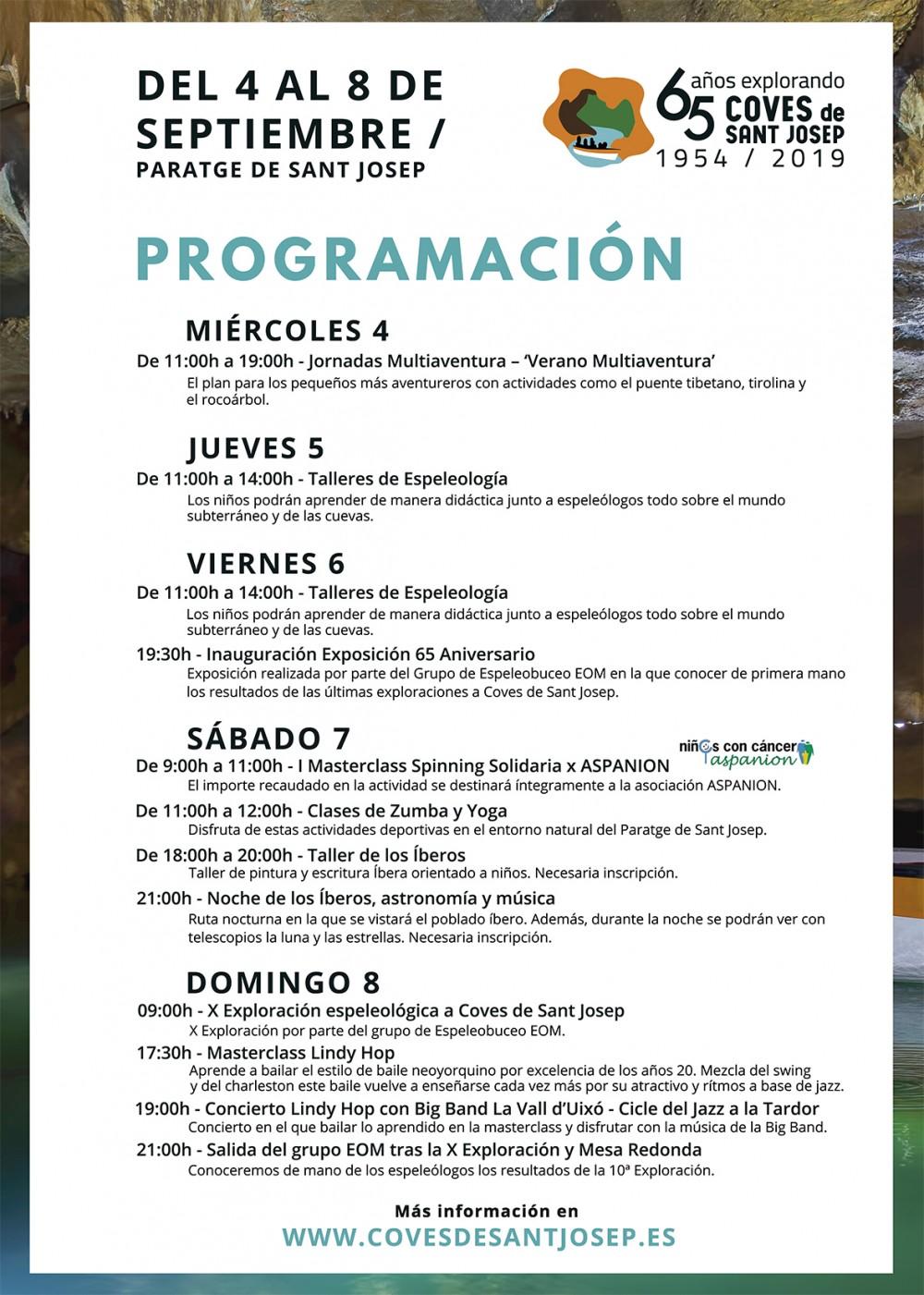 Para celebrar este 65 aniversario el Ayuntamiento de la Vall d'Uixó ha preparado una programación "muy diversa y para todos los públicos" del 4 al 8 de septiembre. El acto más destacado será la realización de décima exploración de los últimos cinco años, a cargo del Grupo de Espeleobuceo EOM, en "una clara apuesta por conocer a fondo el río subterráneo para mejorar su conservación y divulgación" y tratar de "averiguar su origen".