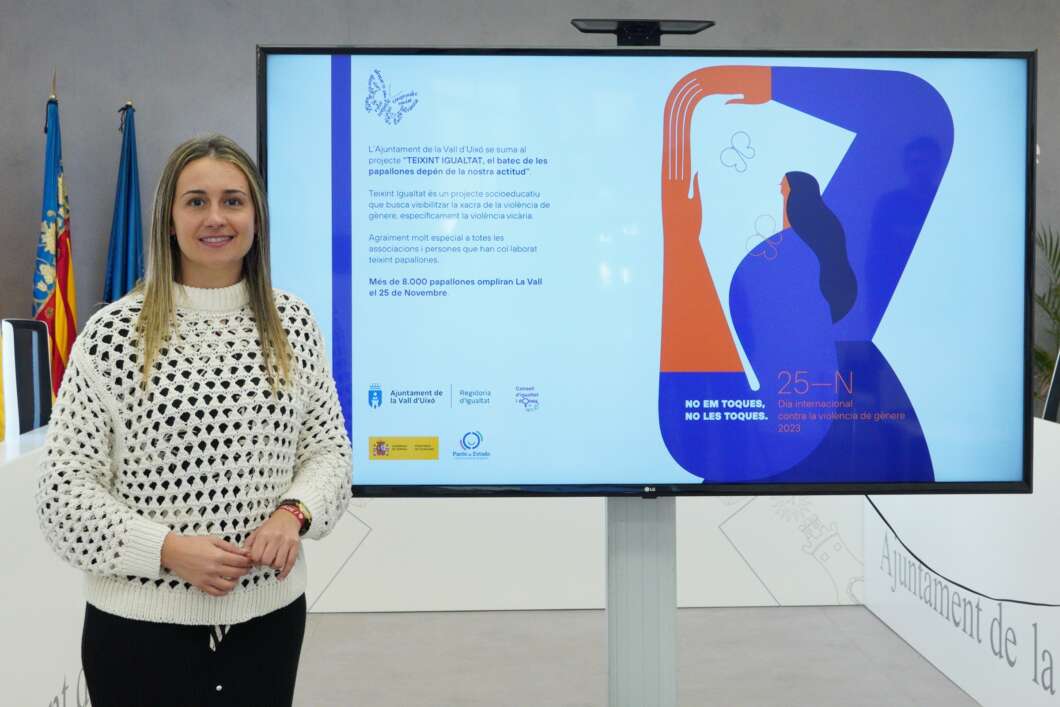 Otro de los ejes de este 25N es el proyecto 'Teixint igualtat, el batec de les papallones depén de la nostra actitud'. Más de 8.000 mariposas de color morado colgarán de la fachada del ayuntamiento y de otros edificios municipales "para visibilizar la violencia vicaria, en la que se utiliza a los hijos e hijas para causar daño a la mujer". La alcaldesa ha agradecido su colaboración desinteresada a todas las personas que las han tejido.