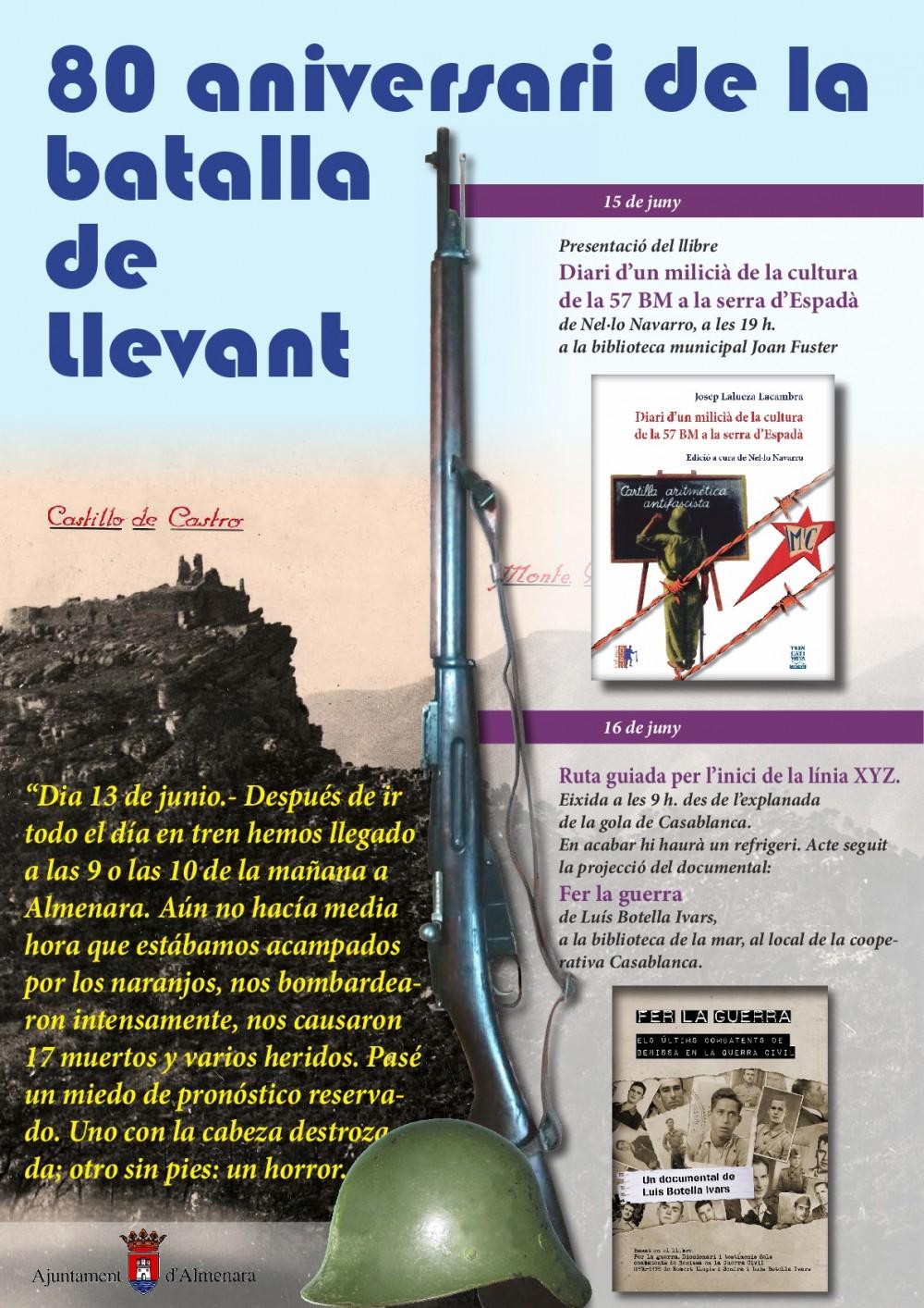 L'Ajuntament d'Almenara ha organitzat una sèrie d'activitats per a commemorar el 80 aniversari de la Batalla de Llevant en la localitat amb una sèrie d'actes que es desenvoluparan tant el divendres com dissabte vinent amb tal fi.