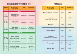 ONG i entitats socials de tot tipus es donaran cita a l'esdeveniment, en el qual oferiran informació sobre l'activitat que desenvolupen i oferiran una quinzena de tallers, jocs i espectacles per a tots els públics, amb l'objectiu de conscienciar sobre la necessitat de ser solidaris. Entre les propostes programades, hi ha un taller d'animació, jocs adaptats a la discapacitat, un taller infantil de circ, així com de manualitats, màscares i taps. Un espectacle familiar, un bingo sonor, un mural de la família, un punt de salut –amb presa de tensió i de glucosa- i un altre de reciclatge són algunes de les iniciatives projectades als diferents estands i a la plaça Major.